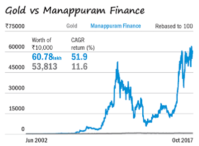 Like wise an Investment of 10,000 in Gold 15 years back would have fetched us today 53,813 vs 60.78 lacs that a Investment in Muthoot would have fetched.