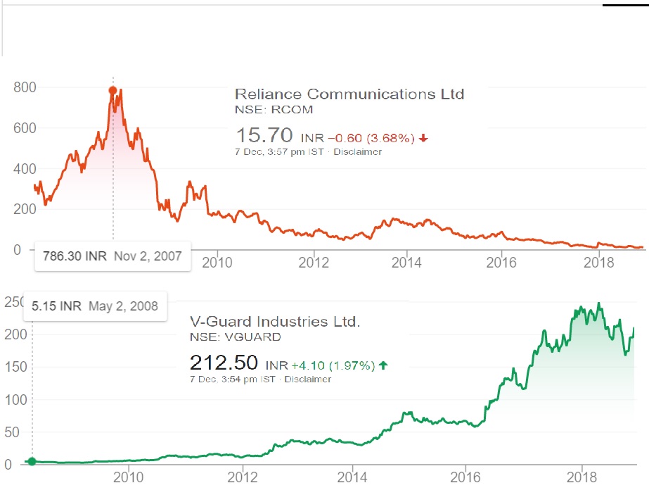 - That you don’t have to do fancy things to be rich. Just simple-boring is enough. V-Guard makes stabilizers while RCom is in much fancier business – “Telecommunications’