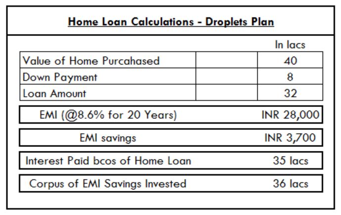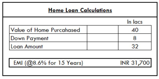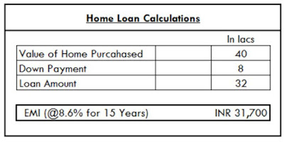 We have normally noticed that most of the home bought are about 40 lacs. WIth 20% down payment, the loan amount comes to 32 lacs. On a loan taken for 15 years at 8.6%, the EMI works out to be INR 31,700. If the loan is duly completed in 15 years, the total interest paid is 25 lacs. Now we have to do plan to get this 25 lacs back.